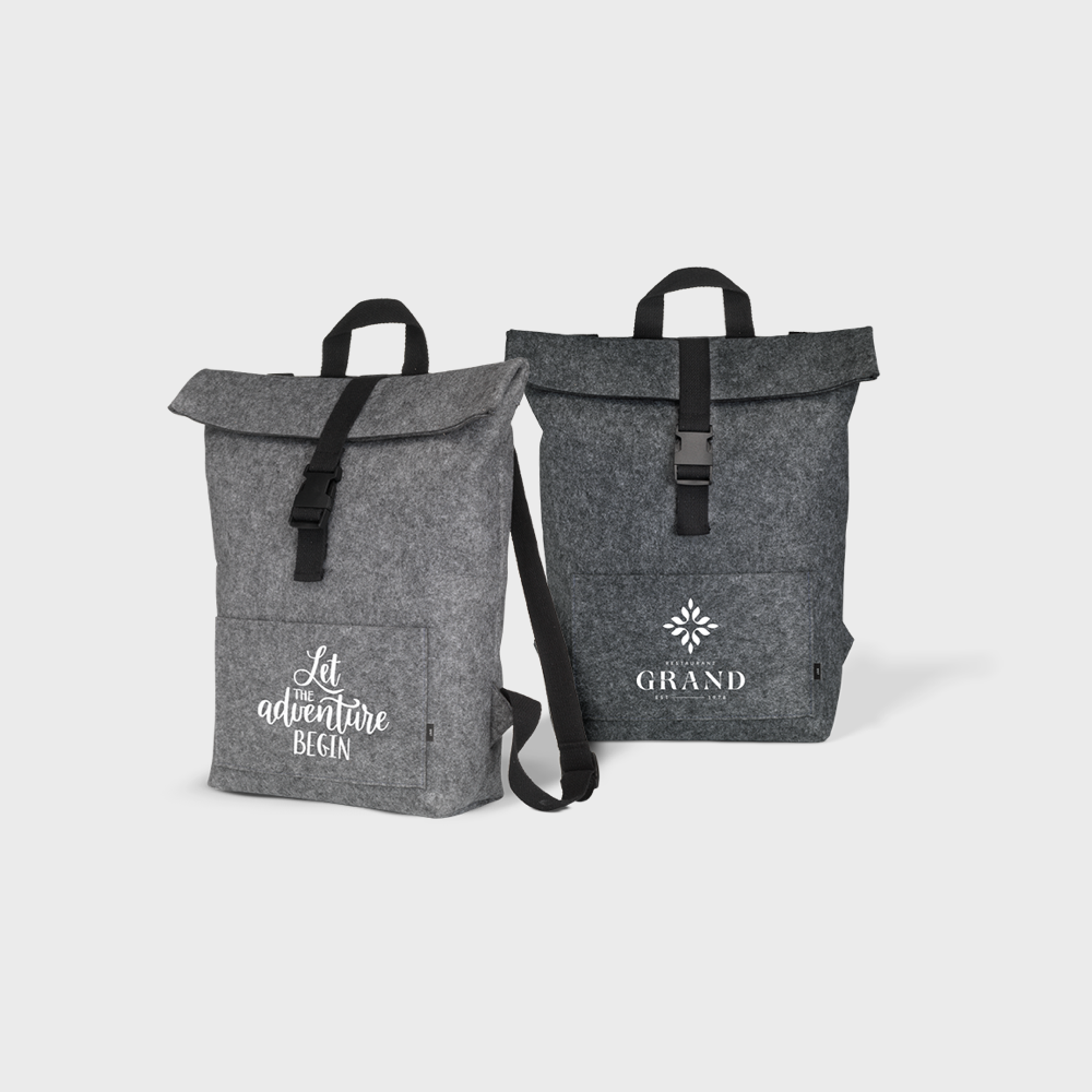 This durable, practical, and sturdy "roll-top" backpack is perfect for any occassion. Plus, it is made with RPET felt making it the obvious eco-friendly choice for you. The backpack includes a spacious inner compartment and a slip pocket on the front. It has a roll top opening with a handy snap closure and adjustable straps. Can contain approx. 15 liters. <br>
