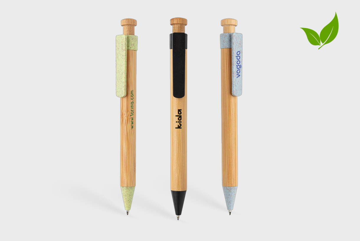 The ideal writing companion, Marfam Print's Bamboo pen with wheat straw clip makes sustainability look beautiful. Ideal for giveaways, print with your branding to show you really care for the environment. The pen is made with bamboo and wheat straw; wheat straw composition of the clip is 40% wheat straw and 60% ABS. The pen writes with blue ink and sits perfectly in your hand. Order yours today!