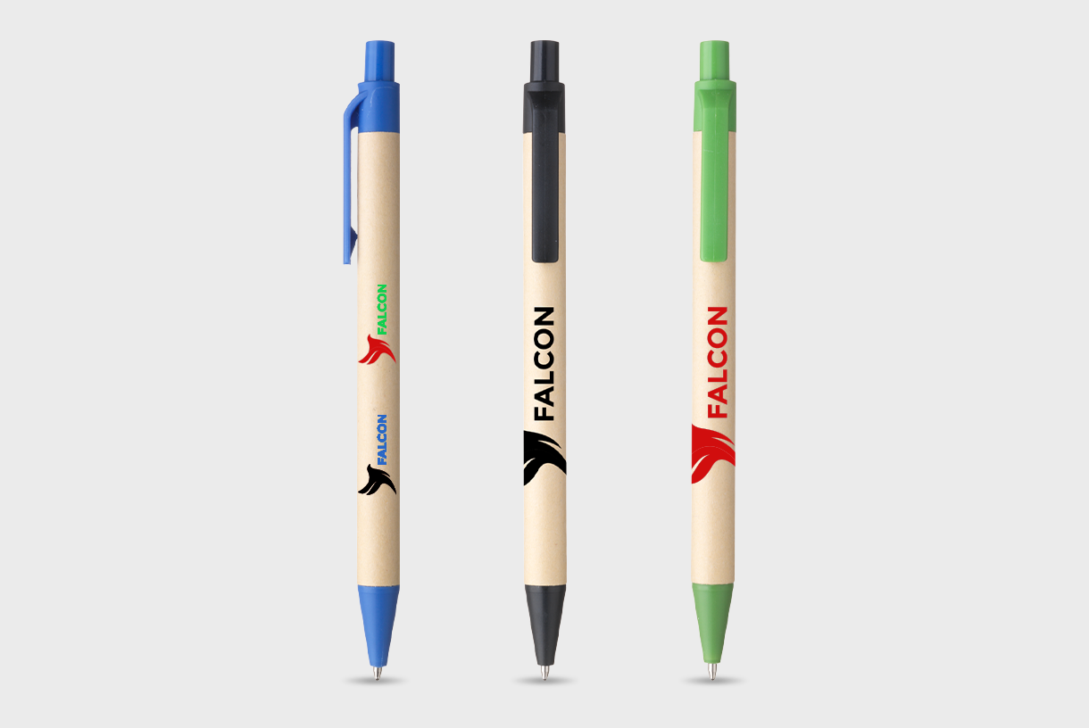 This eco-friendly pen has a barrel made from recycled paper. The coloured clip, push button, and tip are crafted from biodegradable PLA.