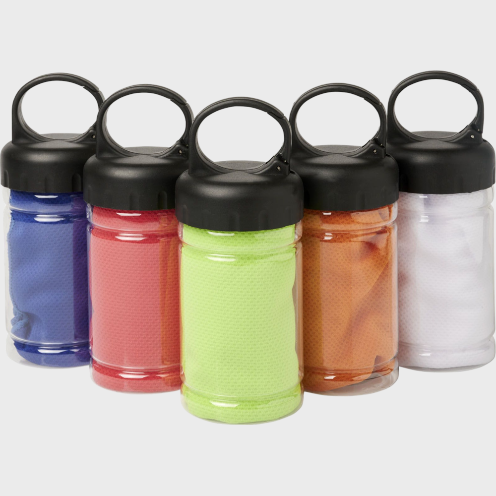 Stay cool and comfortable during any activity with our quick-absorbing and drying fitness towel. It's made from durable polyester and conveniently packaged in a portable container with a carry handle and built-in carabiner for easy transportation. Ideal for workouts and outdoor activities.