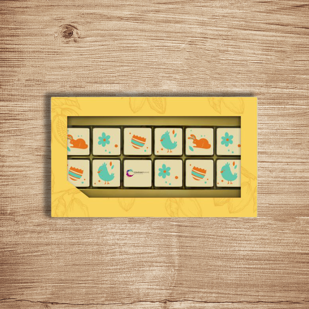 Looking for a unique and creative way to promote your brand this Easter? Look no further than our Chocolate Gift Boxes! The sustainably produced milk chocolate cubes feature 11 beautiful Easter designs and 1 cube to print your own logo or design with edible ink. This box is the perfect giveaway or thank-you gift to get your clients fully into the Easter spirit. Everyone is sure to remember your brand after indulging in this delectable and memorable treat! <br><br>