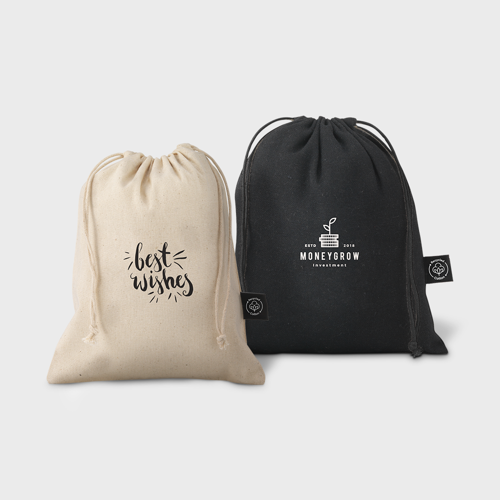 Stylish pouch crafted from recycled cotton, perfect for gifting or storage. Features drawstrings blending recycled polyester and cotton. Certified eco-friendly, combining functionality and sustainability.