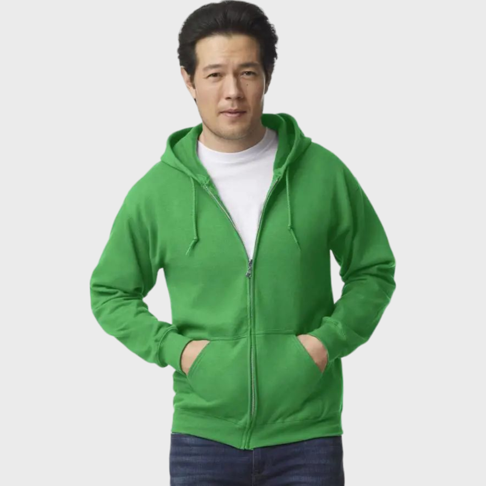 This is a versatile full-zip hooded sweatshirt made from a cozy cotton-blend fabric. Remarkably comfortable with a softer feel thanks to its air jet yarn. It features an unlined hood and metal zip closure. The design layout supports full front printing and it comes with a handy pouch pocket. Enjoy the twin needle waistband and cuffs that ensure durability, along with 1×1 rib with spandex for stretchability. Its quarter-turned design eliminates any centre crease.