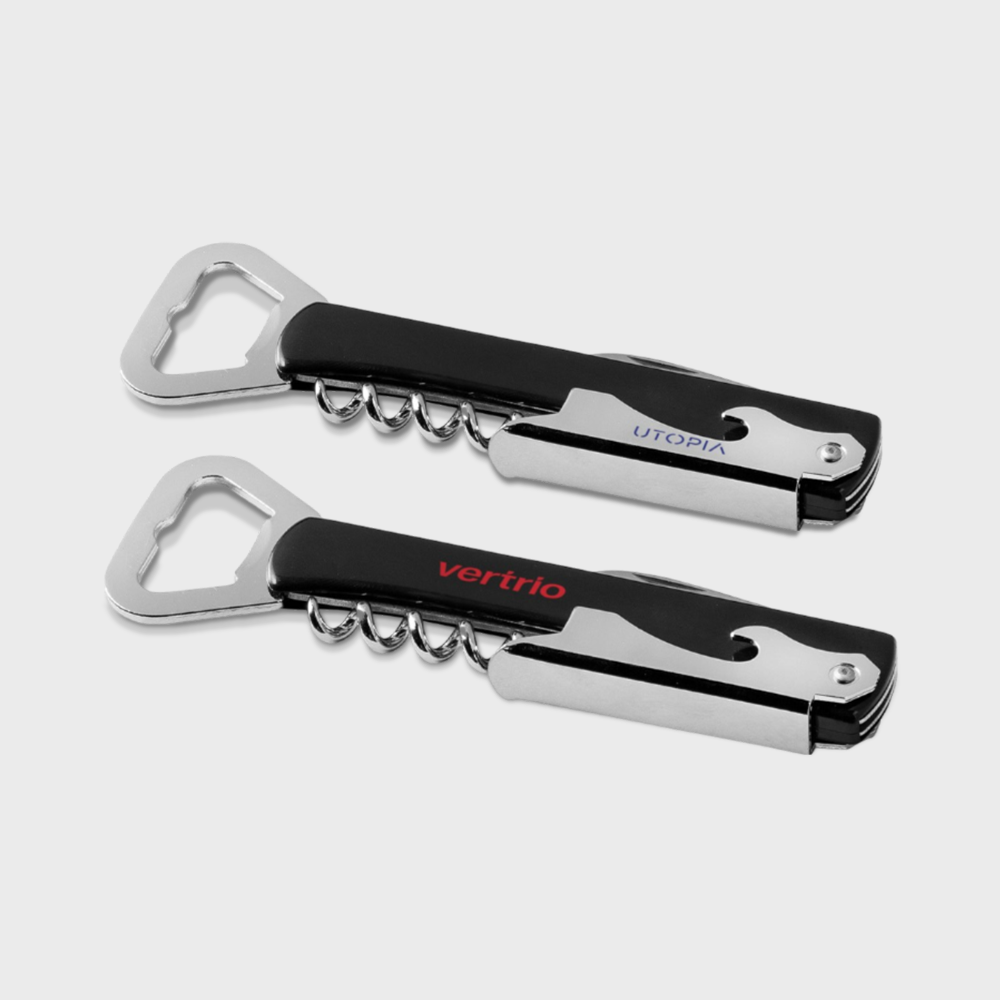A versatile tool that combines a bottle opener, a corkscrew and a foil cutter.