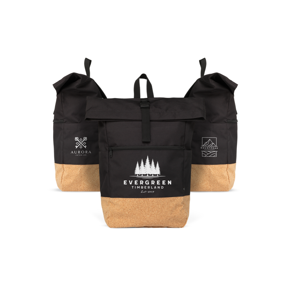 Practical 'roll-top' backpack made of sustainable materials: RPET polyester combined with high-quality cork.<br>