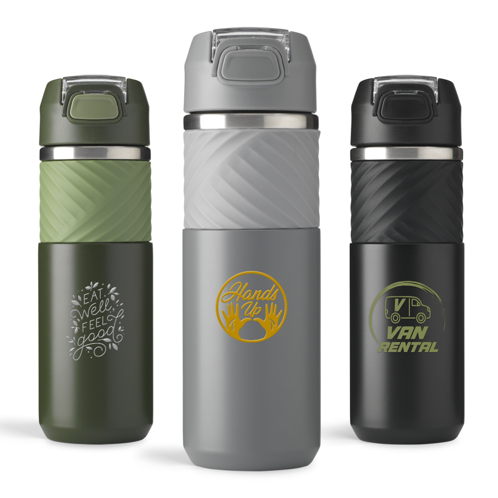 Make a responsible choice with this double-walled bottle made from recycled stainless steel. It features a leak-proof screw cap, a collapsible silicone drinking spout with straw, and a hygienically closed push-button lid with lock. Ideal for exercising or car journeys. The rubber non-slip grip adds extra convenience, while its stylish yet sturdy design stands out. Keep your hot or cold drink at the perfect temperature.