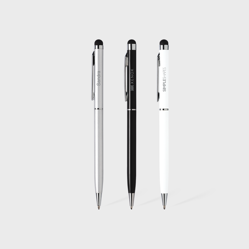 A sleek companion for both writing and touch screens. This metal ballpoint pen features a rubber top for easy use with your devices. Stylish gloss accents and a twist mechanism make it sophisticated and practical.