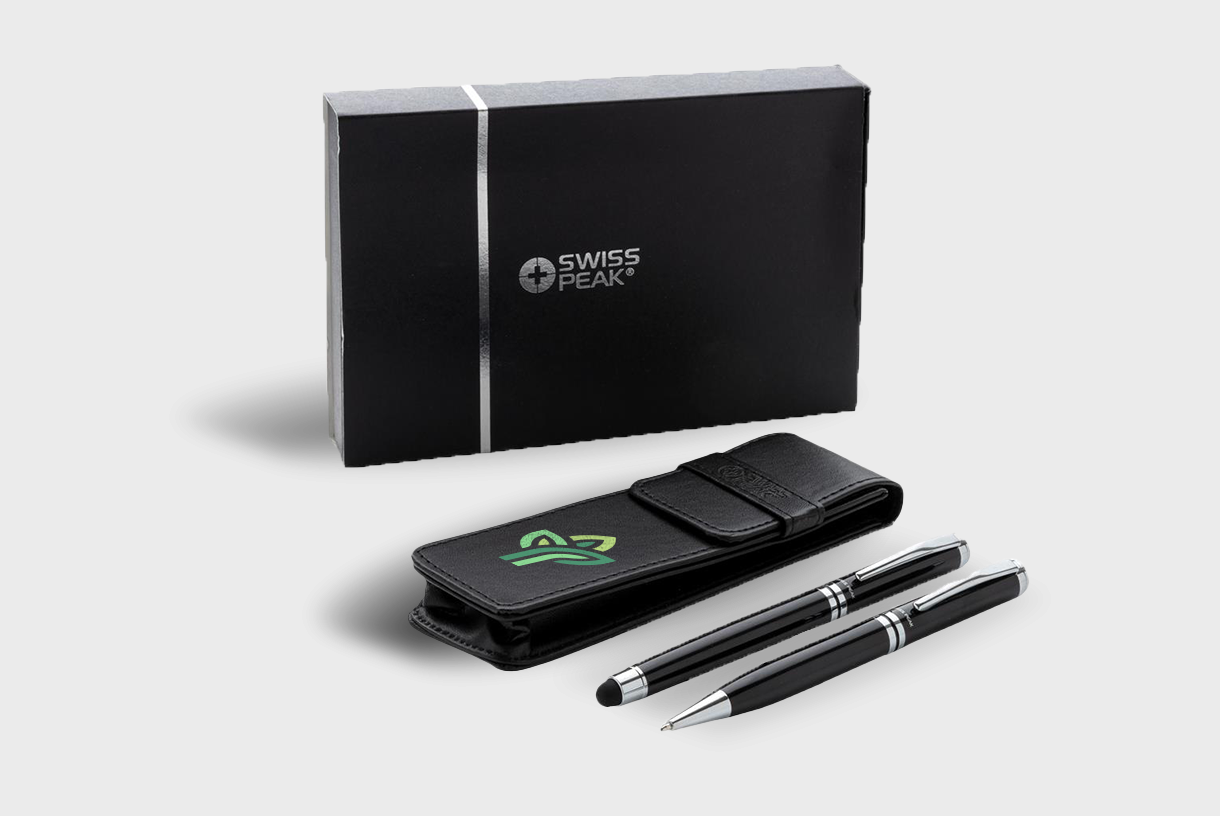 Elevate your writing with this authentic pen set, showcasing timeless Swiss Peak quality. Featuring a heavy brass rollerball with stylus and a matching ballpoint pen, each crafted for precision and durability. Presented in a premium PU leather pouch and elegant gift box, it’s the perfect set for gifting or personal use. Includes smooth blue ink for a refined writing experience.