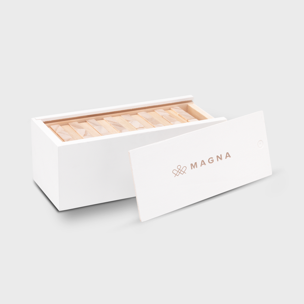 The wooden stacking game consists of 48 blocks and has a tower dimension of 15.5 x 6 x 6 cm. The blocks are easy to store in a stylish white wooden box with a sliding opening. This party game comes with game rules, so you can start playing right away. Each game is individually packed in a kraft box, ensuring sustainable and eco-friendly packaging. Perfect for fun game nights with friends and family!