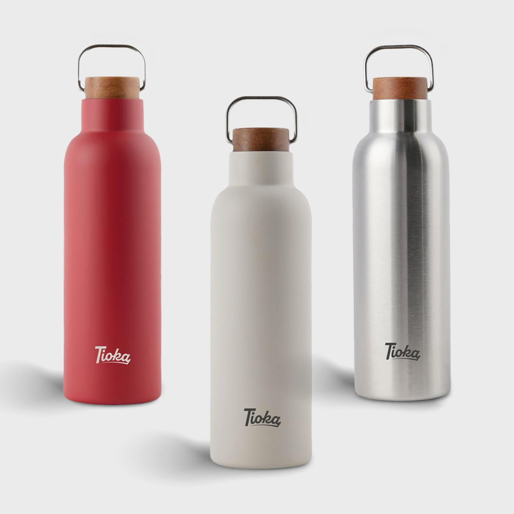 An elegant and beautifully designed thermos bottle with a handy acacia wood lid with a metal loop, making it easy to transport. Made from recycled stainless steel, it maintains your drink's temperature for extended periods, perfect for both hot and cold beverages